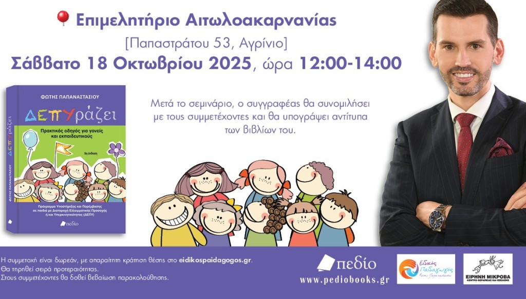 Αγρίνιο: Σεμινάριο ΔΕΠΥ με αφορμή το βιβλίο "ΔΕΠΥράζει" του Φ. Παπαναστασίου (Σαβ 18/10/2025 12:00)