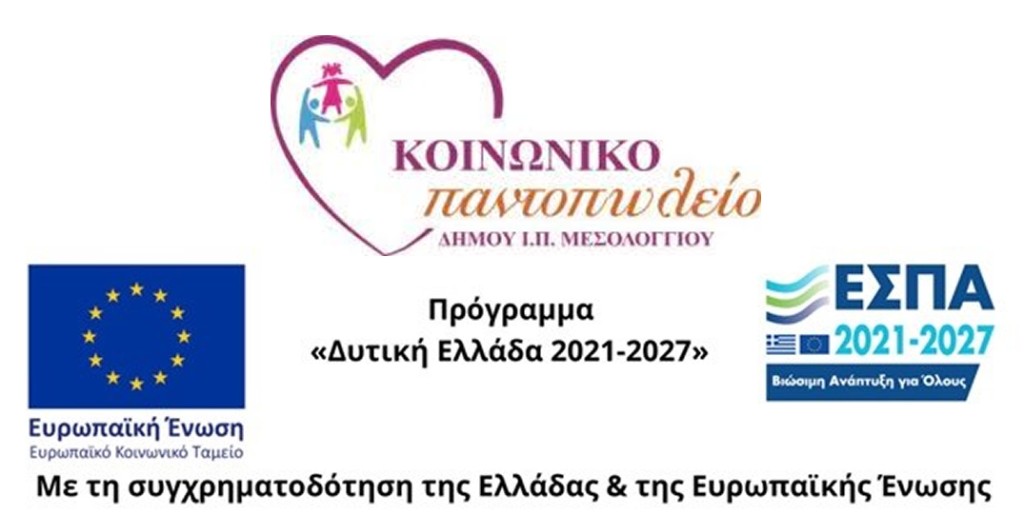 Η πράξη «Συνέχιση Δομών Παροχής Βασικών Αγαθών: Κοινωνικό Παντοπωλείο Δήμου Ι.Π. Μεσολογγίου» με Κωδικό ΟΠΣ 6002338, εντάσσεται στο Επιχειρησιακό Πρόγραμμα «Δυτική Ελλάδα 2021-2027» και συγχρηματοδοτείται από το Ευρωπαϊκό Κοινωνικό Ταμείο+ (Ε.Κ.Τ.+).