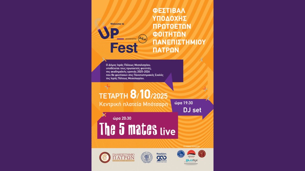 Την Τετάρτη 8 Οκτωβρίου 2025, ο Δήμος Ιερής Πόλης Μεσολογγίου και το Πανεπιστήμιο Πατρών υποδέχονται τους πρωτοετείς φοιτητές με το «Welcome to Up Fest»!