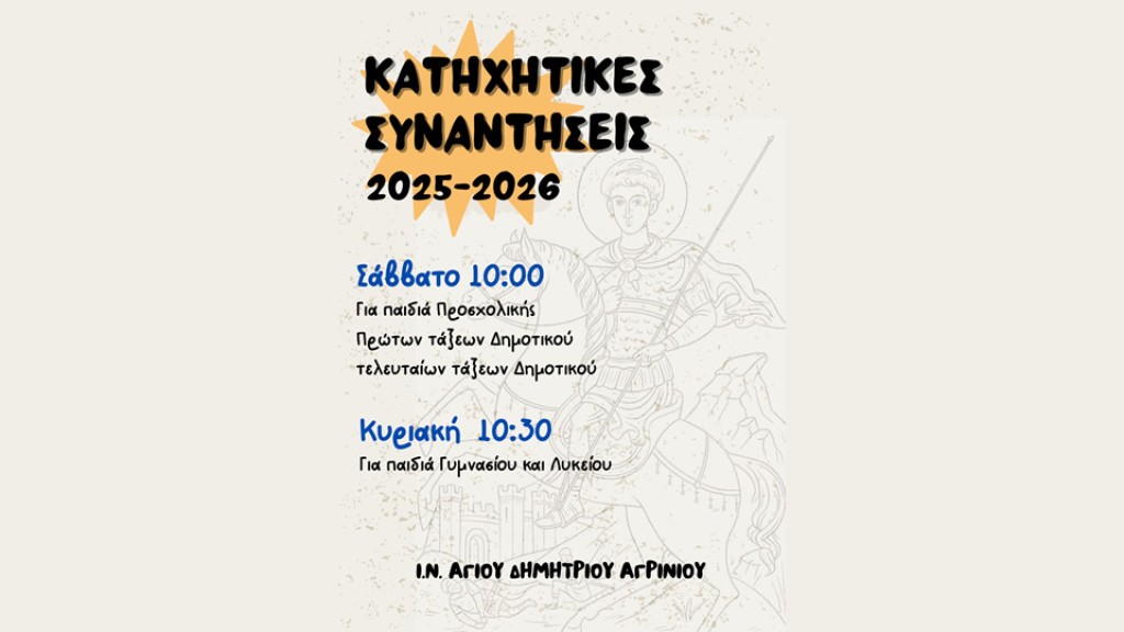 Ο  Ι. Ν. Αγίου Δημητρίου Αγρινίου ξεκινά τις πνευματικές ευκαιρίες για τη νέα περίοδο και σε καλεί να έρθεις κοντά . Οι συναντήσεις έχουν οριστεί ως εξής: