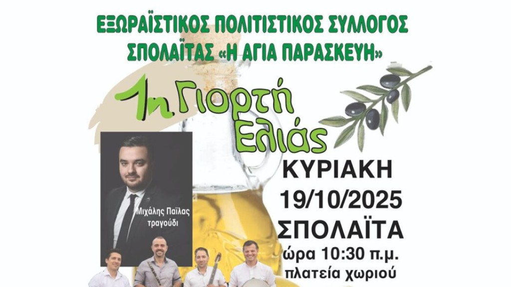 Ο Εξωραϊστικός Πολιτιστικός Σύλλογος Σπολάιτας «Η Αγία Παρασκευή» διοργανώνει την 1η Γιορτή Ελιάς την Κυριακή 19 Οκτωβρίου 2025 και ώρα 10:30 το πρωί στην πλατεία του χωριού.