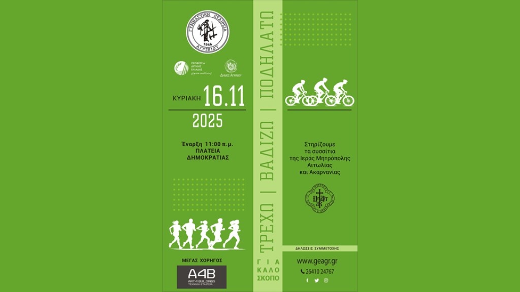 Tην Κυριακή 16 Νοεμβρίου 2025 στις 11 π.μ., η Γυμναστική Εταιρεία Αγρινίου, η Περιφέρεια Δυτικής Ελλάδας και ο Δήμος Αγρινίου, διοργανώνουν για 8η φορά το «Τρέχω, βαδίζω, ποδηλατώ», με αφετηρία και τερματισμό την Πλατεία Δημοκρατίας Αγρινίου. Πρόκειται, για αγώνες (τρέξιμο, βάδισμα, ποδηλασία) που δεν έχουν συναγωνιστικό χαρακτήρα, ενώ δεν απαιτείται κάποιο κόστος συμμετοχής σε αυτούς.
