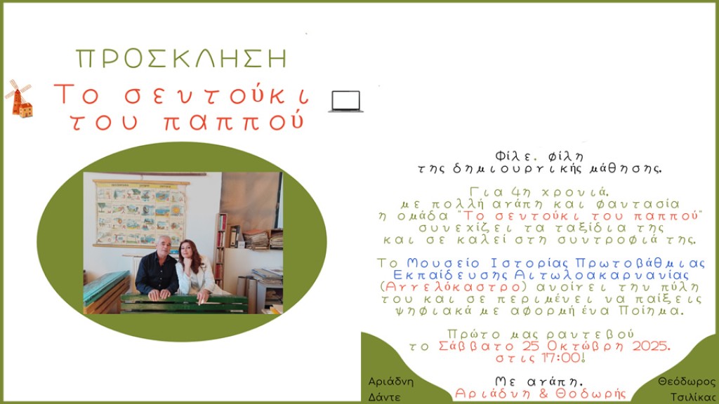 Για 4η χρονιά η Αριάδνη Δάντε, ο Θεόδωρος Τσιλίκας και η δημιουργική ομάδα "Το σεντούκι του παππού" σας προσκαλούν στο Μουσείο Ιστορίας Πρωτοβάθμιας Εκπαίδευσης Αιτωλοακαρνανίας (Αγγελόκαστρο) για ένα εργαστήρι δημιουργικής μάθησης που συνδυάζει την αγάπη για την Ποίηση και την Τεχνολογία.