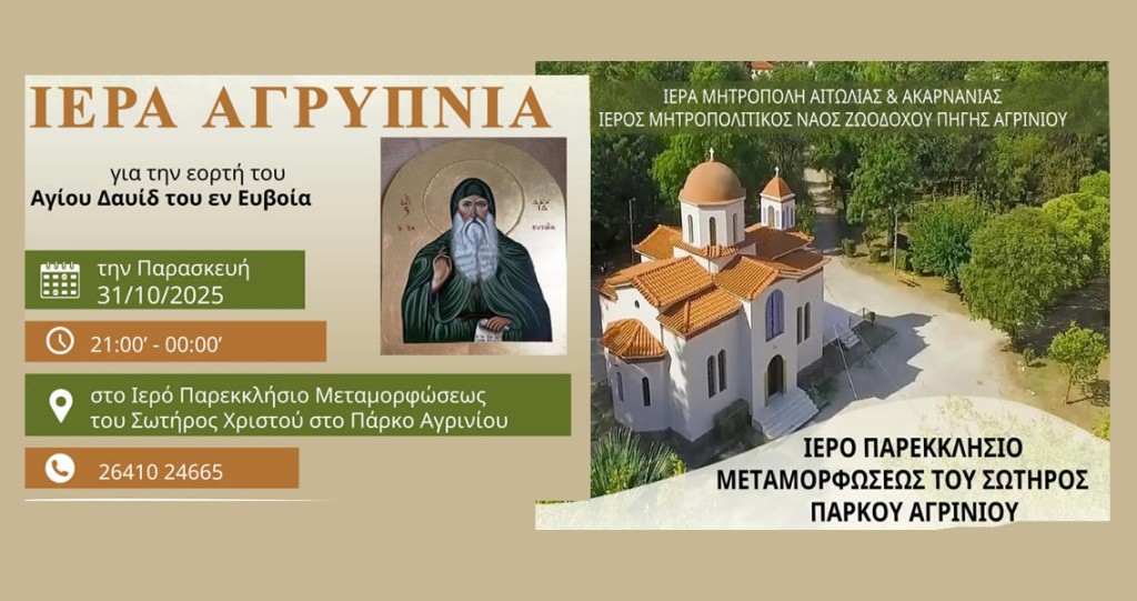 Την Παρασκευή 31 Οκτωβρίου 2025 στο Ιερό Παρεκκλήσιο Μεταμορφώσεως του Σωτήρος Χριστού που βρίσκεται εντός του Παπαστρατείου Δημοτικού Πάρκου Αγρινίου, θα τελεσθεί Ιερά Αγρυπνία για την εορτή του Αγίου Δαυίδ του Γέροντος του εν Ευβοία.