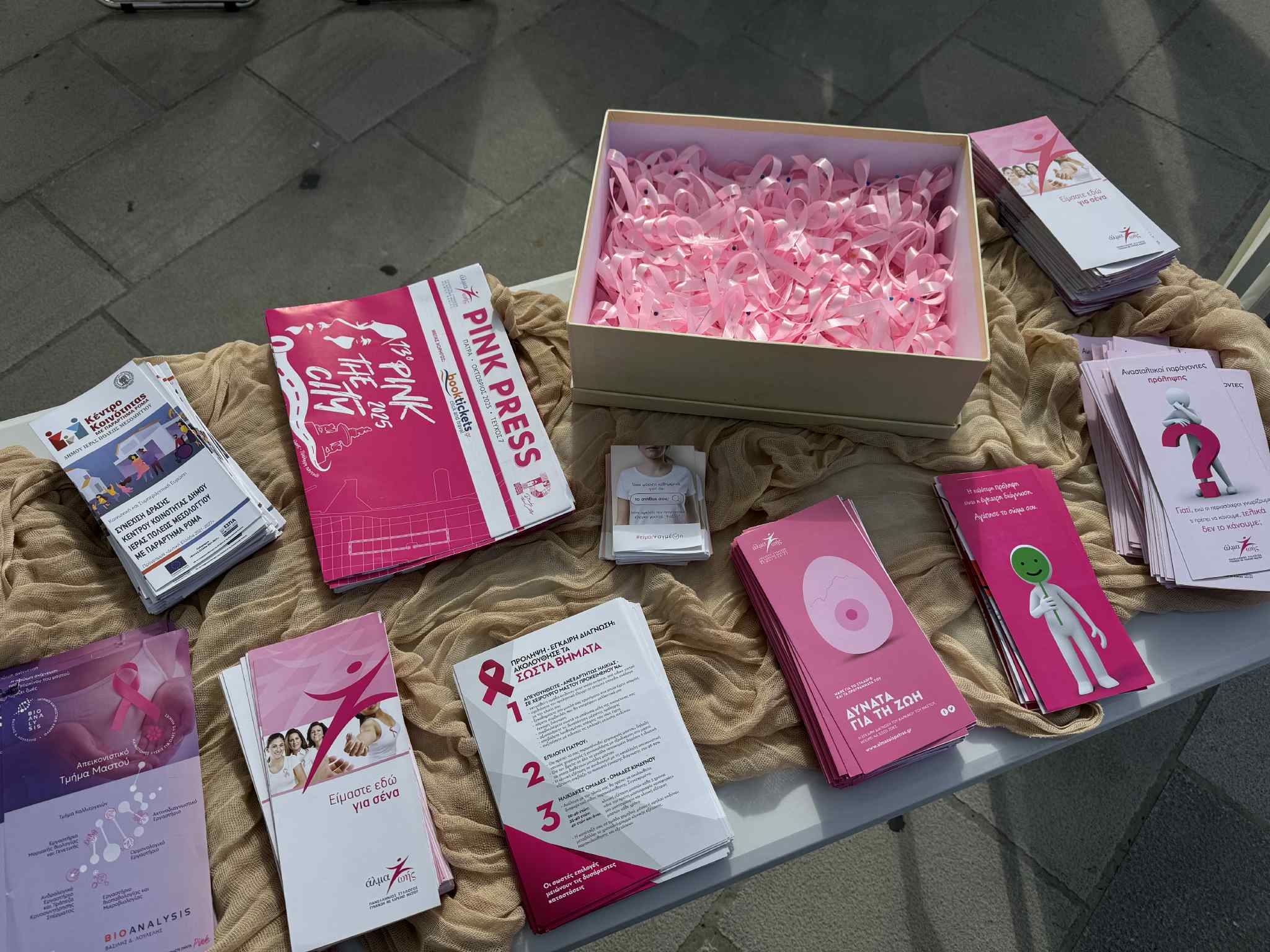 Πλήθος κόσμου πέρασε από το περίπτερο του Δήμου, παραλαμβάνοντας ενημερωτικό υλικό και τις ροζ κορδέλες — σύμβολο της μάχης κατά του καρκίνου του μαστού — εκφράζοντας την υποστήριξή του στο μήνυμα της πρόληψης, ενώ τη δράση στήριξαν με την παρουσία τους μέλη του Λαογραφικού Συλλόγου Μεσολογγίου, του Συλλόγου Γυναικών Κατοχής «Αλθαία» και του Συλλόγου Γυναικών Μεσολογγίου «Άρτεμις».