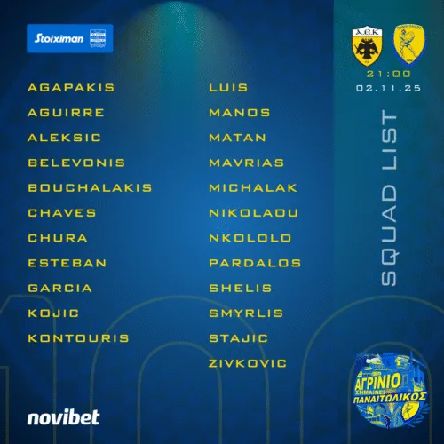 Στην αποστολή του αυριανού εκτός έδρας αγώνα με την ΑΕΚ συμμετέχουν οι ποδοσφαιριστές: