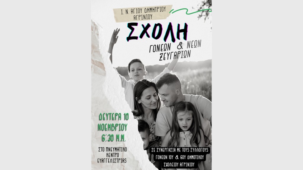 Από Δευτέρα 10 Νοεμβρίου 2025 και κάθε Δευτέρα στις 6:30μ.μ. στο πνευματικό κέντρο του Ι.Ν. Αγίου Δημητρίου στην Ευαγγελίστρια, σε συνεργασία με τους συλλόγους γονέων και κηδεμόνων του 1ου και 6ου Δημοτικού Σχολείου Αγρινίου θα ξεκινήσει η σχολή γονέων.