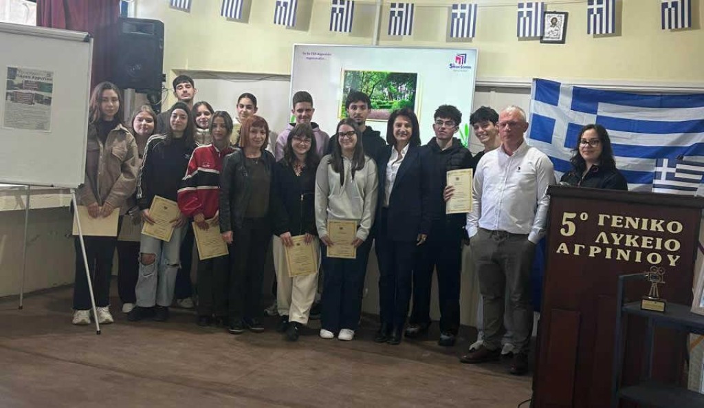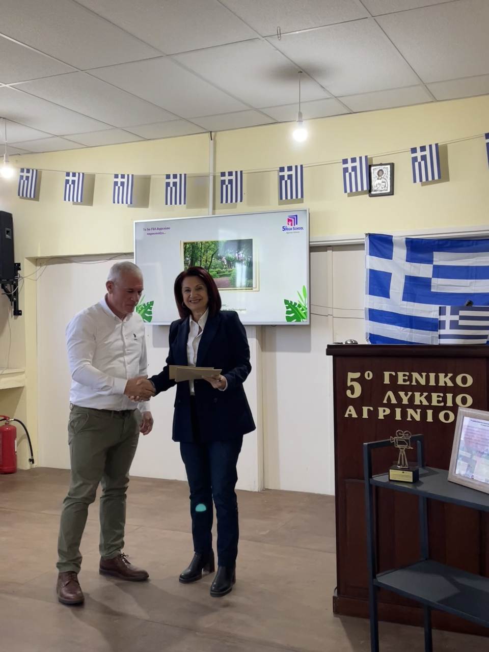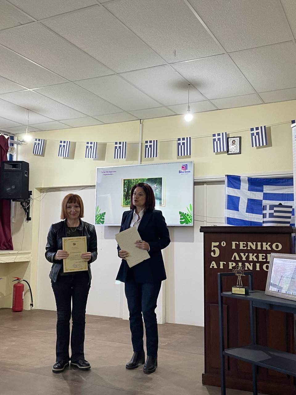 Το 5ο ΓΕΛ Αγρινίου επισκέφτηκε η Αντιδήμαρχος Πολιτισμού κ. Μαρία Παπαγεωργίου, για να συγχαρεί από κοντά τους μαθητές, για τη σπουδαία διάκριση στον 7ο Διεθνή Μαθητικό Διαγωνισμό «Η ιστορία σου, είναι ιστορία της πόλης σου» με το ντοκιμαντέρ «Το Πάρκο μας… Μια Διαδρομή Μνήμης και Πολιτισμού».