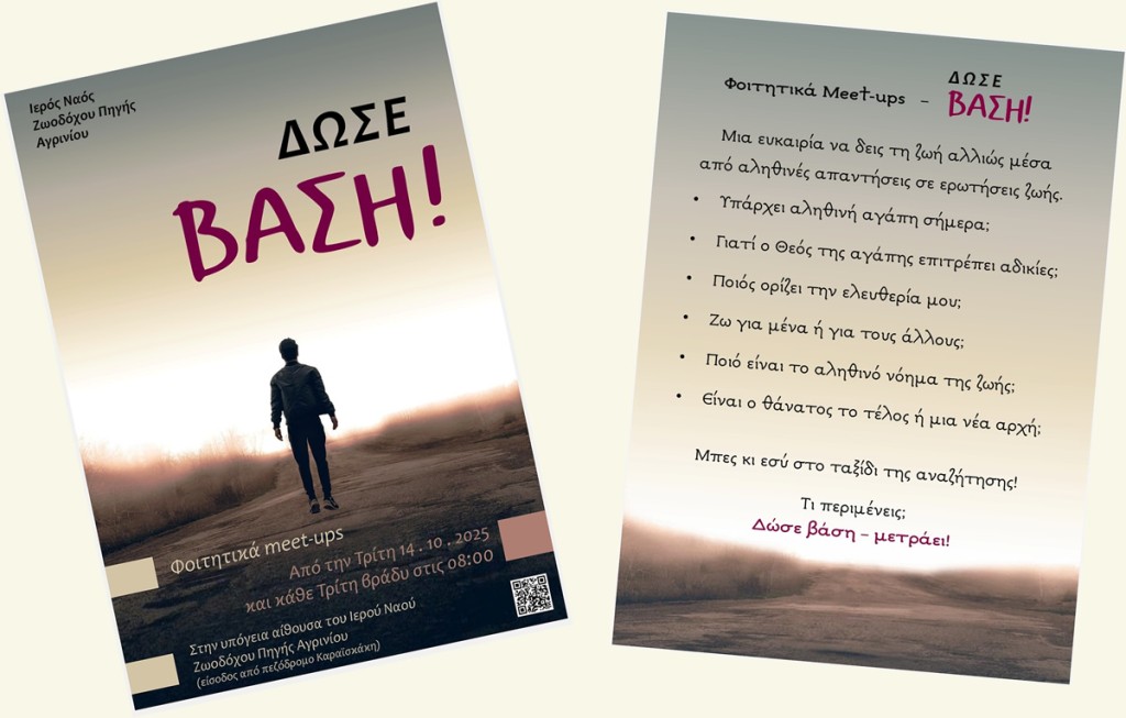Η νέα ακαδημαϊκή χρονιά ξεκίνησε και μαζί της άρχισαν και οι Συναντήσεις Φοιτητών και Νέων του Ιερού Μητροπολιτικού Ναού Ζωοδόχου Πηγής Αγρινίου.