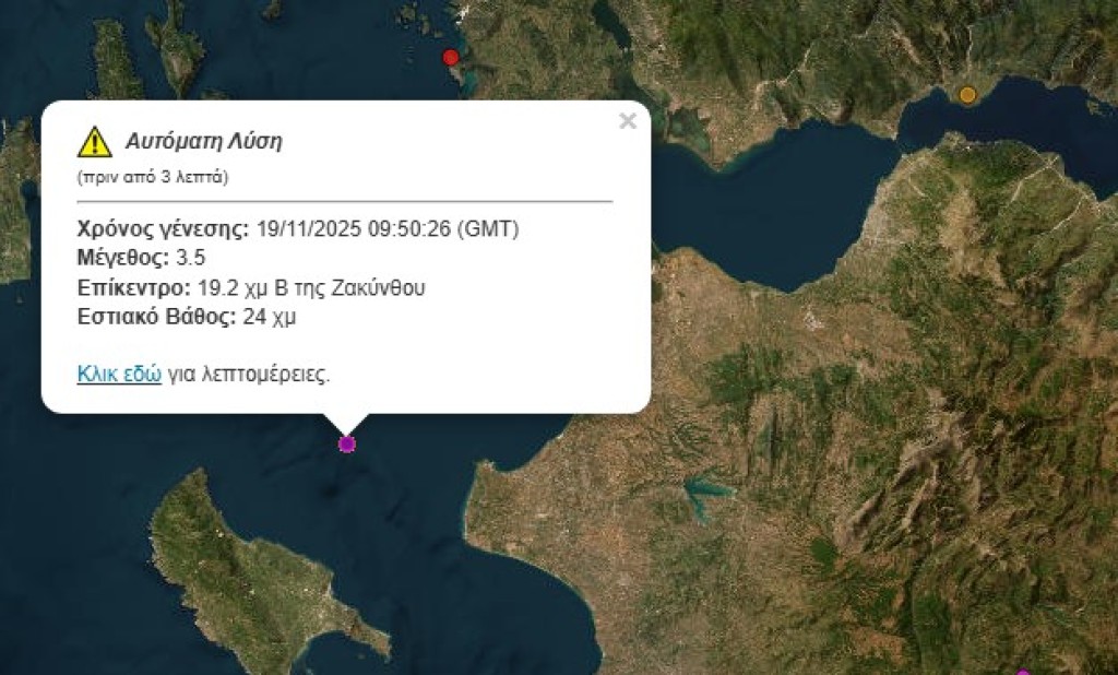 Σεισμός σημειώθηκε στις 11:50 το πρωί της Τετάρτης (19/11) κοντά στην Κεφαλονιά. Έγινε αισθητός σε περιοχές της Αιτωλοακαρνανίας.