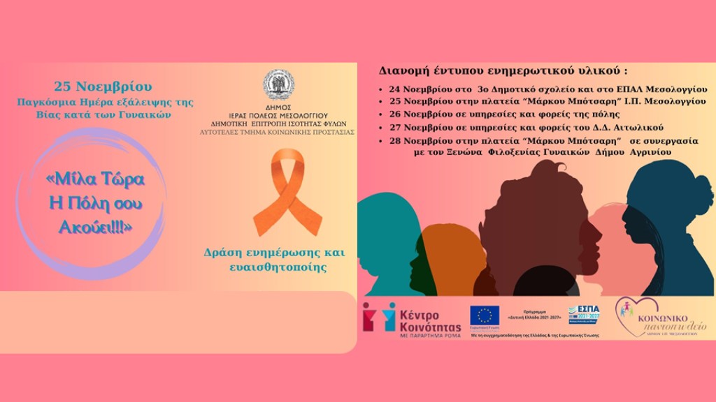 Ο Δήμος Ιερής Πόλης Μεσολογγίου, η Δημοτική Επιτροπή Ισότητας και το Αυτοτελές Τμήμα Κοινωνικής Προστασίας με τις κοινωνικές δομές του (Κέντρο Κοινότητας & Κοινωνικό Παντοπωλείο), με αφορμή την Παγκόσμια Ημέρα για την Εξάλειψη της Βίας κατά των Γυναικών (25 Νοεμβρίου), διοργανώνουν την Εβδομάδα Ενημέρωσης και Ευαισθητοποίησης, από τις 24 έως τις 28 Νοεμβρίου 2025.