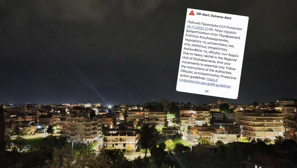Προειδοποίηση για ισχυρές βροχοπτώσεις από την Πολιτική Προστασία ήχησε το βράδυ της Τετάρτης 26ης Νοεμβρίου 2025 μέσω του 112, προς τους κατοίκους στο Αγρίνιο.