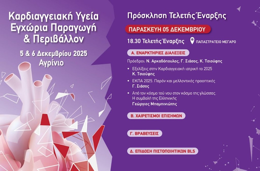 Και φέτος, για τρίτη χρονιά στις 5-6 Δεκεμβρίου του 2025 διοργανώνεται στο Αγρινιο συνέδριο με θέμα καρδιαγγειακή υγεία, περιβάλλον και εγχώρια παραγωγή.