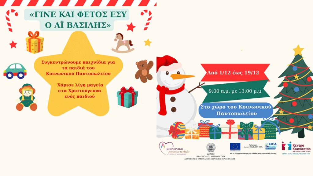 Τα Χριστούγεννα πλησιάζουν… Οι Κοινωνικές Δομές του Δήμου Ιερής Πόλης Μεσολογγίου, το Κοινωνικό Παντοπωλείο και το Κέντρο Κοινότητας με Παράρτημα Ρομά, για τέταρτη συνεχόμενη χρονιά διοργανώνουν την εκστρατεία «Γίνε φέτος εσύ ο Αϊ-Βασίλης!».