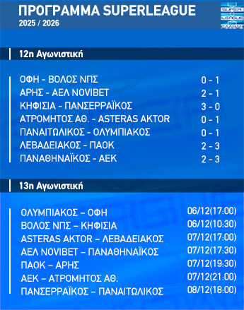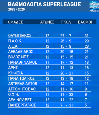 Με την ολοκλήρωση της 12ης αγωνιστικής στην SuperLeague σεζόν 2025-2026 η βαθμολογία διαμορφώθηκε ως ακολούθως: