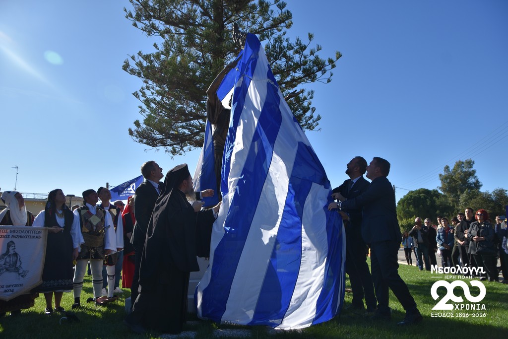 Τα αποκαλυπτήρια του ανδριάντα πραγματοποιήθηκαν από τον Σεβασμιώτατο Μητροπολίτη Αιτωλίας και Ακαρνανίας κ.κ. Δαμασκηνό, τον Περιφερειάρχη Δυτικής Ελλάδας, κ. Νεκτάριο Φαρμάκη, τον Δήμαρχο Ιεράς Πόλεως Μεσολογγίου, κ. Σπυρίδων Διαμαντόπουλο και τον γλύπτη Ευάγγελο Τύμπα, παρουσία του Αντιπεριφερειάρχη Αιτωλοακαρνανίας, κ. Θανάση Μαυρομμάτη.