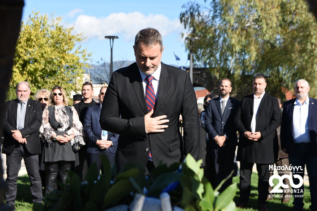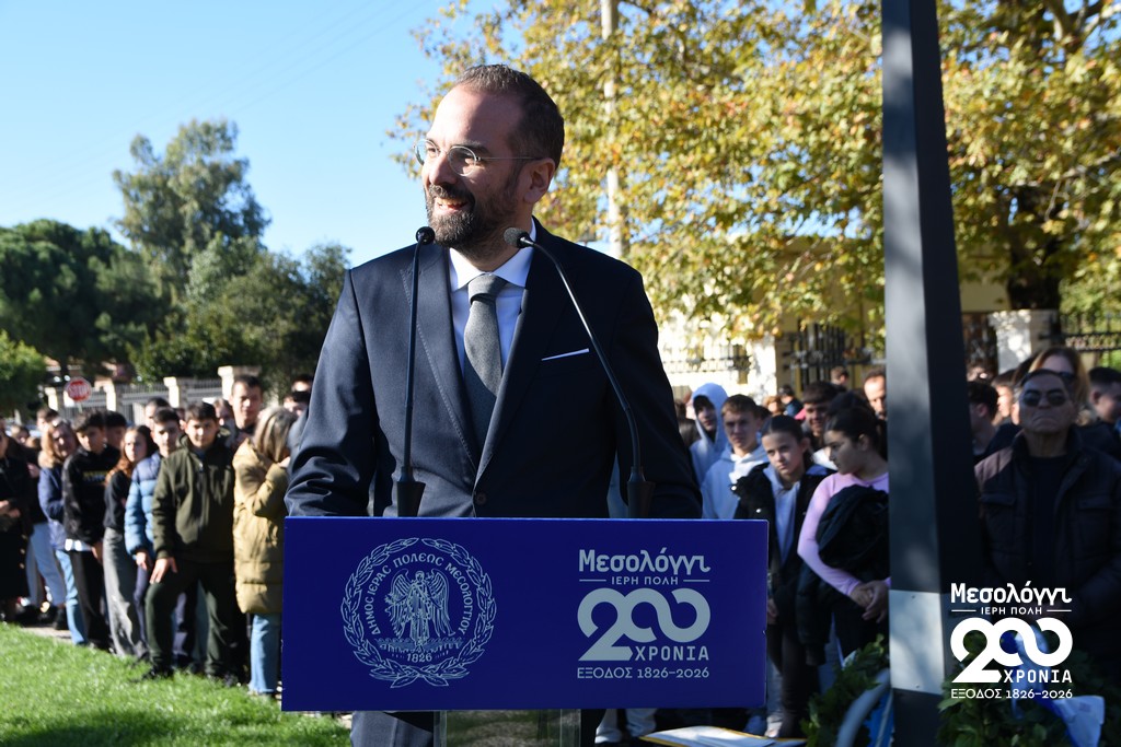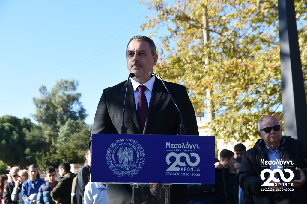 Στον χαιρετισμό του, ο Δήμαρχος Ιεράς Πόλεως Μεσολογγίου, κ. Σπυρίδων Διαμαντόπουλος, ευχαρίστησε θερμά τον Περιφερειάρχη Δυτικής Ελλάδας, κ. Νεκτάριο Φαρμάκη, για την πρωτοβουλία και τη γενναιόδωρη χειρονομία του να δημιουργηθεί ο ανδριάντας. Επίσης, ευχαρίστησε τους συνεργάτες του για την ολοκλήρωση της ανάπλασης της πλατείας Δημογέροντα Χρήστου Καψάλη, επισημαίνοντας ότι η αναβάθμιση της Πύλης και της εισόδου της πόλης δεν περιορίζεται μόνο στο αισθητικό μέρος. Αντιθέτως, αποσκοπεί στη δημιουργία ενός ιστορικού τοπόσημου, που θα συμβολίζει τη θυσία των ηρώων και θα ενισχύει τη συλλογική μνήμη του τόπου, με επιπλέον αναβάθμιση και εξωραϊσμό του χώρου.