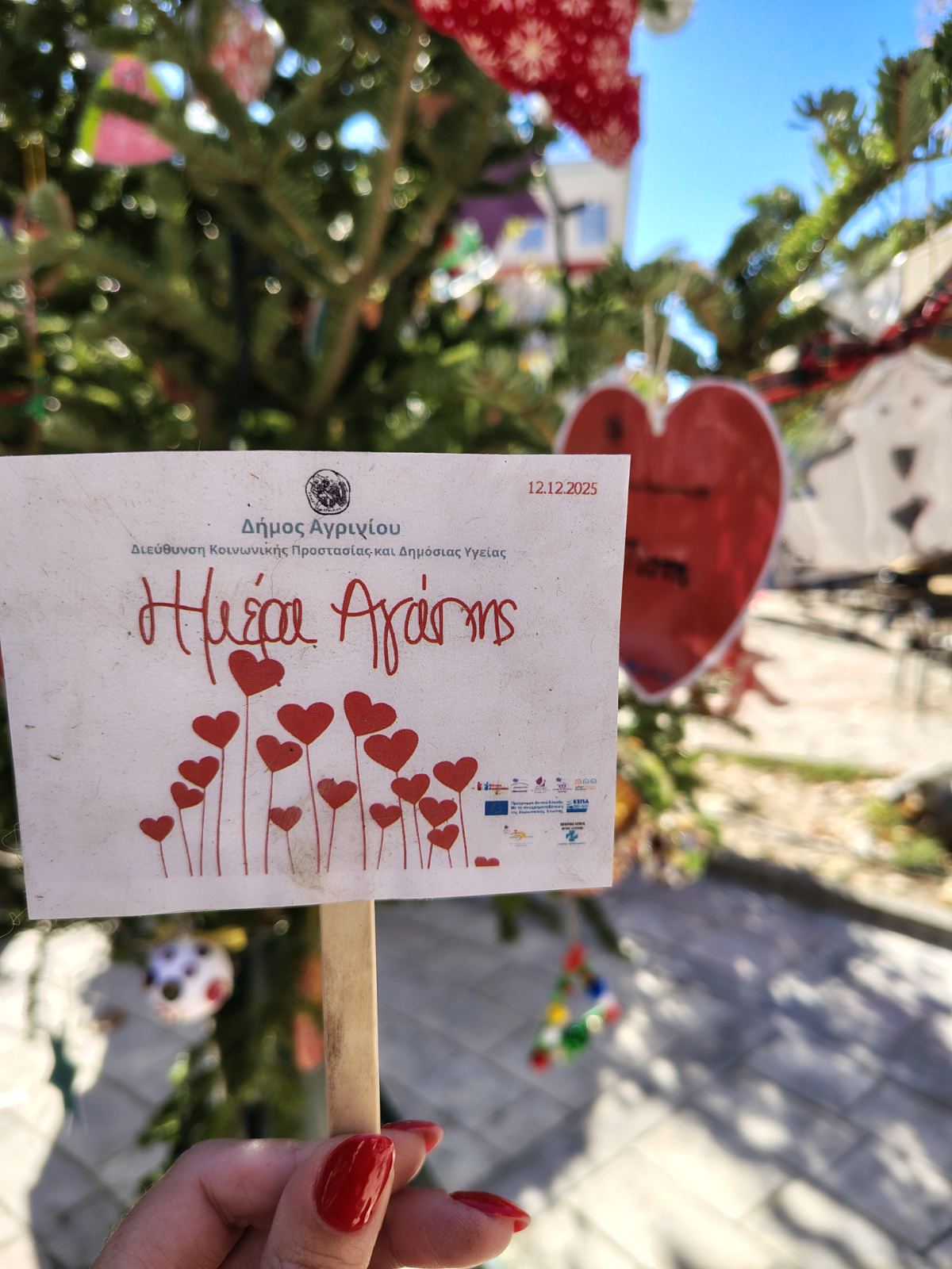 Με αφορμή την Παγκόσμια Ημέρα Αγάπης, η Διεύθυνση Κοινωνικής Προστασίας και Δημόσιας Υγείας του Δήμου Αγρινίου, σε συνεργασία με όλες τις κοινωνικές δομές του Δήμου, πραγματοποίησε σήμερα, 12 Δεκεμβρίου 2025, τη δράση «Δέντρο της Αγάπης» στην Πλατεία Παναγόπουλου, στο Συντριβάνι.