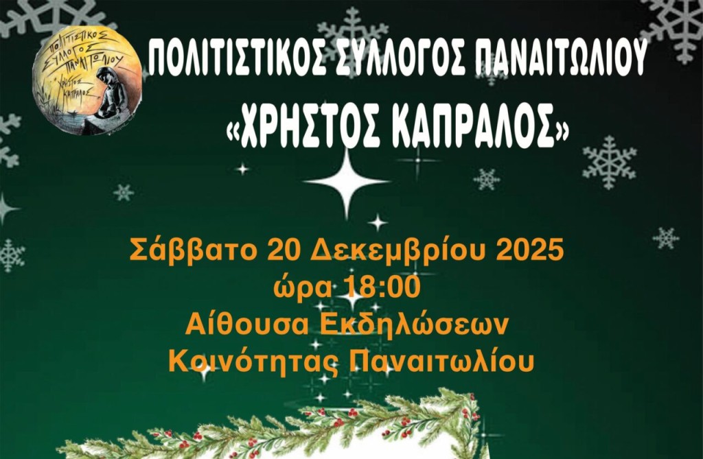 Η εκδήλωση θα πραγματοποιηθεί το Σάββατο 20 Δεκεμβρίου 2025 και ώρα 18.00 μ.μ. στην Αίθουσα Εκδηλώσεων της Κοινότητας Παναιτωλίου.
