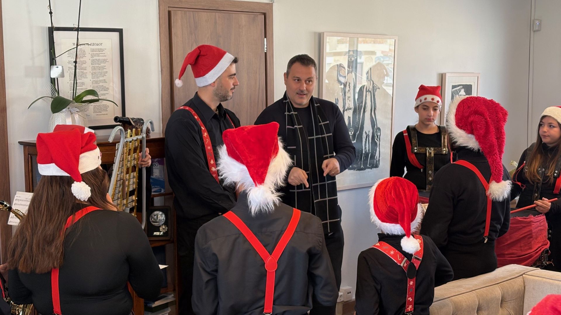 Οι μικροί μουσικοί, συνοδευόμενοι από τον Αρχιμουσικό τους, κ. Δημήτρη Μανωλάτο, επισκέφθηκαν το γραφείο του Δημάρχου Σπύρου Διαμαντόπουλου, ψάλλοντας τα χριστουγεννιάτικα κάλαντα και ερμηνεύοντας χαρούμενες εορταστικές μελωδίες, γεμίζοντας τον χώρο με νότες, χαμόγελα και το πνεύμα των Χριστουγέννων.