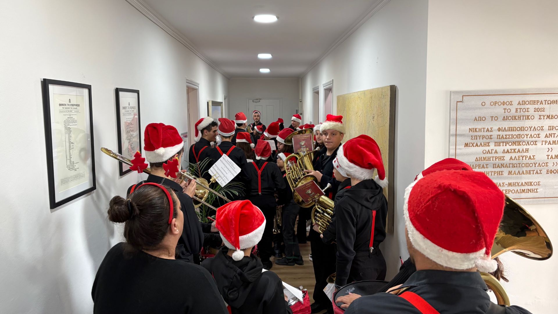 Στη συνέχεια, τα μέλη της Φιλαρμονικής περιόδευσαν και στους χώρους των υπηρεσιών του Δήμου, ψάλλοντας τα κάλαντα και μεταφέροντας το εορταστικό κλίμα και στους εργαζόμενους.