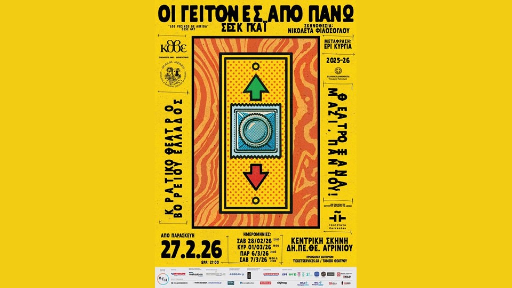 Το Δη.Πε.Θε.Αγρινίου συνεχίζει και τη νέα χρονιά με το καλλιτεχνικό του πρόγραμμα της σαιζόν 2025-2026, παρουσιάζοντας την Παρασκευή 27 Φεβρουαρίου 2026 σε συμπαραγωγή με το Κρατικό Θέατρο Βορείου Ελλάδος την παράσταση «Οι γείτονες από πάνω» του Cesc Gay, σε σκηνοθεσία της Νικολέτας Φιλόσογλου. Η παράσταση τελεί υπό την αιγίδα του Ινστιτούτου Θερβάντες της Αθήνας.