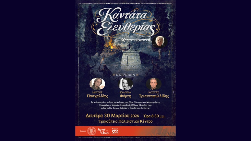 Στο πλαίσιο του εορτασμού για τη Διακοσιοστή Επέτειο από την Ηρωική Έξοδο των Ελευθέρων Πολιορκημένων, ο Δήμος Ιεράς Πόλεως Μεσολογγίου έχει την τιμή να φιλοξενήσει μια κορυφαία καλλιτεχνική στιγμή. Τη Δευτέρα, 30 Μαρτίου 2026 και ώρα 8:30 μ.μ., το Τρικούπειο Πολιτιστικό Κέντρο θα αποτελέσει το σκηνικό για την παρουσίαση της «Καντάτας Ελευθερίας» του σπουδαίου συνθέτη Χρήστου Λεοντή.