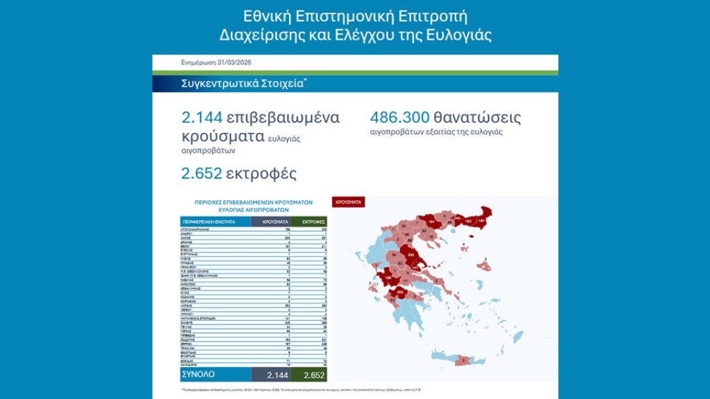 Το Υπουργείο Αγροτικής Ανάπτυξης και Τροφίμων ενημερώνει ότι, σύμφωνα με τα επικαιροποιημένα συγκεντρωτικά στοιχεία της Εθνικής Επιστημονικής Επιτροπής Διαχείρισης και Ελέγχου της Ευλογιάς, για το διάστημα Αυγούστου 2024 – 29 Μαρτίου 2026 έχουν καταγραφεί συνολικά: