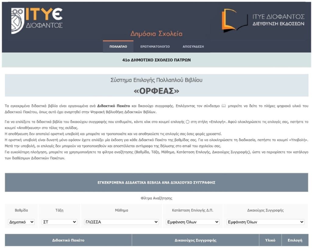 *Το πληροφοριακό Σύστημα Επιλογής Πολλαπλών Βιβλίων «Ορφέας» για χρήση από τις Σχολικές Μονάδες, έρχεται να υποστηρίξει τη διαδικασία επιλογής διαθέσιμων διδακτικών πακέτων ανά βαθμίδα, τάξη και μάθημα. Στην εφαρμογή αυτή μπορούν να εισέρχονται μόνο εξουσιοδοτημένοι μέσω Π.Σ.Δ χρήστες των σχολικών μονάδων, προκειμένου να υποβάλουν τις επιλογές διδακτικών πακέτων ανά βαθμίδα, τάξη και μάθημα. Η εφαρμογή προσφέρει τη μέγιστη δυνατή εργονομία στην πλοήγηση και καθοδήγηση του χρήστη. Παρέχει πίνακα με τα ανά μάθημα διδακτικά πακέτα, ανάμεσα στα οποία θα επιλέξει, οδηγίες αναφορικά με τα βήματα επιλογής. Επίσης, δίνει τη δυνατότητα προσωρινής αποθήκευσης των επιλογών του καθώς και δυνατότητα αλλαγής των επιλογών. Κατά το τελικό στάδιο υποβολής ενημερώνει τον χρήστη για όποια εκκρεμότητα επιλογής και τον προστατεύει ώστε να αποφύγει να υποβάλλει ελλιπή υποβολή. Μετά τη υποβολή τον ενημερώνει για το κατάλογο υποβολών του.