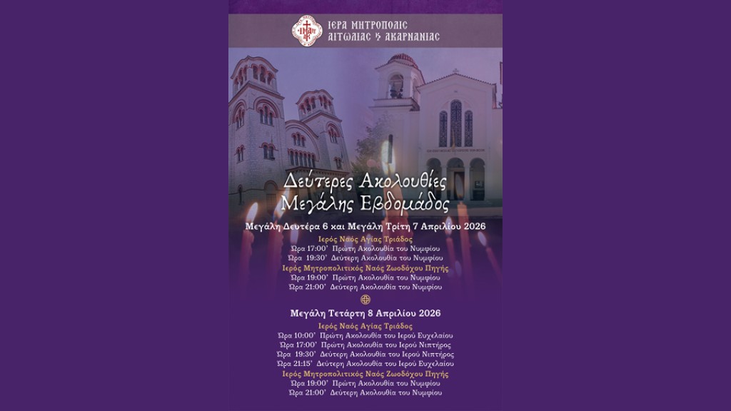 Η Ιερά Μητρόπολη Αιτωλίας και Ακαρνανίας θέλοντας να προσφέρει την δυνατότητα σε εργαζομένους, νέους και μαθητές να συμμετέχουν στις Ιερές Ακολουθίες του Νυμφίου το απόγευμα της Μεγάλης Δευτέρας και της Μεγάλης Τρίτης, καθώς και στην Ιερά Ακολουθία του Νιπτήρος το απόγευμα της Μεγάλης Τετάρτης έχει καθιερώσει την τέλεση δεύτερης Ακολουθίας στο Αγρίνιο, στον Ιερό Μητροπολιτικό Ναό Ζωοδόχου Πηγής, στις 21:00’ το βράδυ. Η πρώτη ακολουθία στον Ιερό Μητροπολιτικό Ναό θα αρχίζει στις 19:00’ το απόγευμα.
