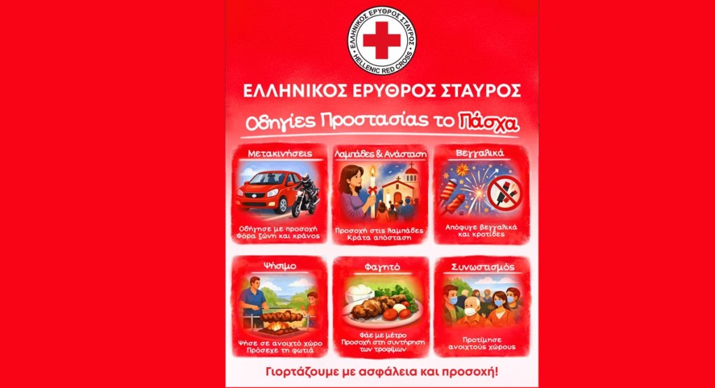 Ο Ελληνικός Ερυθρός Σταυρός, με αίσθημα ευθύνης απέναντι στην κοινωνία, συστήνει στους πολίτες βασικές οδηγίες πρόληψης και ασφάλειας για την περίοδο του Πάσχα, με στόχο τον εορτασμό των ημερών αυτών με υγεία και προσοχή.