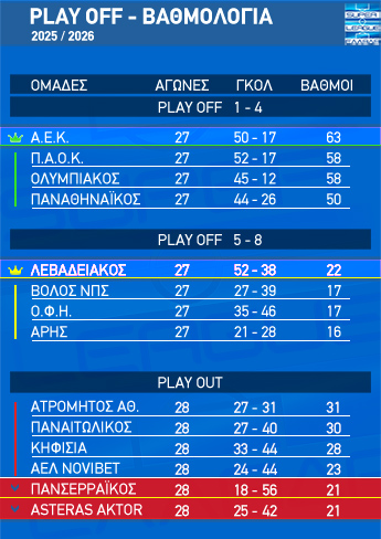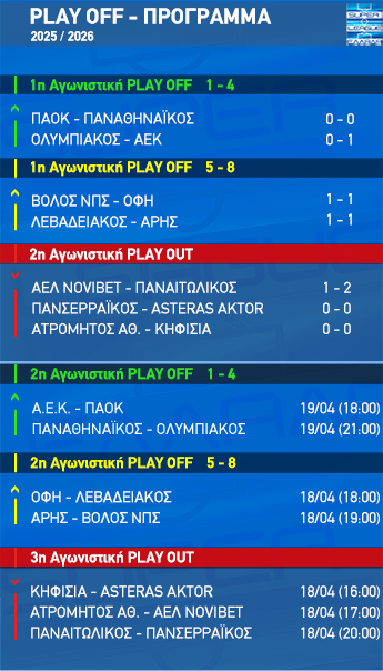 Η βαθμολογία της SuperLeague μετά την 1η αγωνιστική Play OFF & την 2η αγωνιστική Play OUT της σεζόν 2025-2026