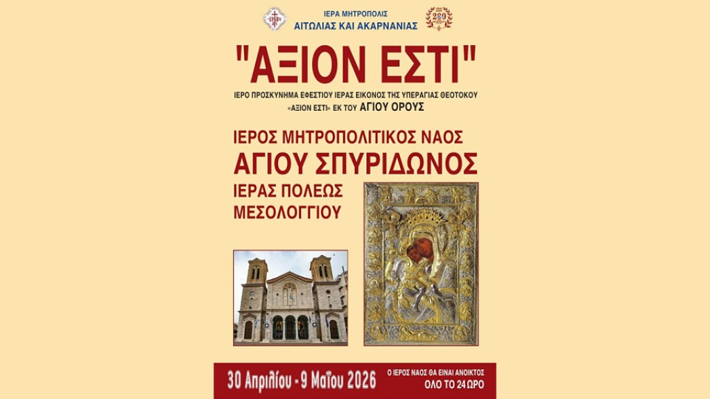 Με αισθήματα βαθείας συγκινήσεως και πνευματικής αγαλλιάσεως η Ιερά Μητρόπολις Αιτωλίας και Ακαρνανίας αναγγέλλει προς τον ευσεβή λαό την έλευση της Ιεράς και Θαυματουργού Εικόνος της Υπεραγίας Θεοτόκου «Άξιον Εστί» εκ του πανσέπτου Ιερού Ναού του Πρωτάτου του Αγίου Όρους, στην Ιερά Πόλη του Μεσολογγίου.