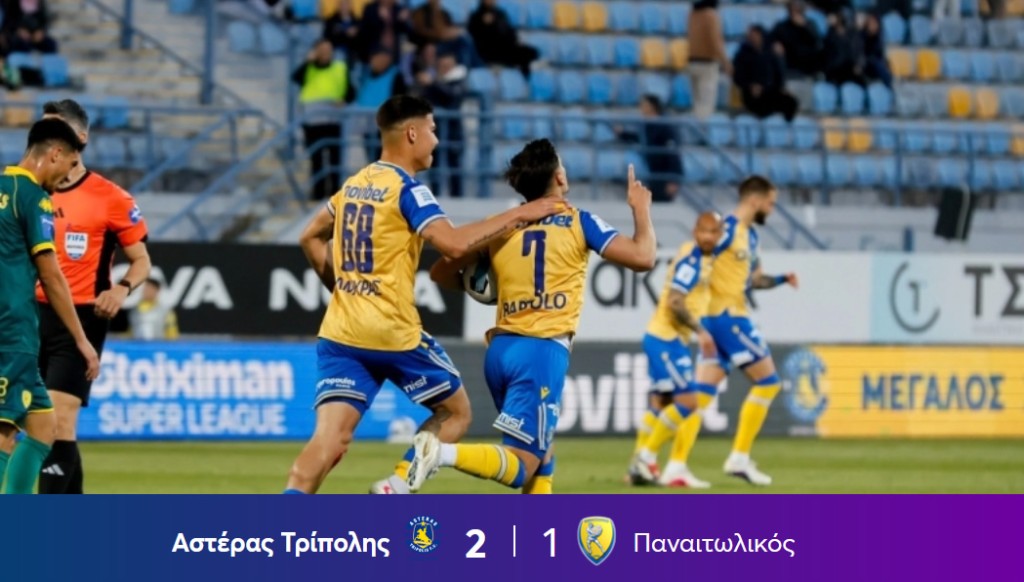Νίκη - ανάσα προς την παραμονή και μάλιστα με ανατροπή πέτυχε ο Αστέρας Τρίπολης που επικράτησε με 2-1 του Παναιτωλικού! Ήρωας του ματς ο κίπερ Παπαδόπουλος που έπιασε στο 89' το πέναλτι του Ρόσα. Μπαρτόλο και Μακέδα τα γκολ του τριπόντου!