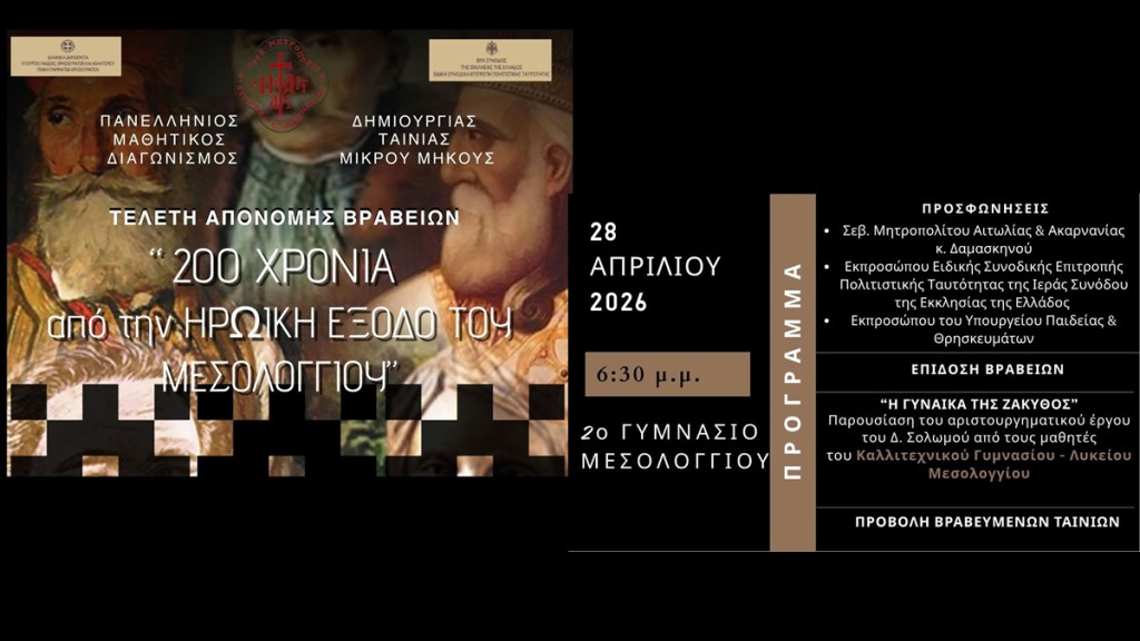 Η τελετή βράβευσης των διακριθέντων μαθητών θα πραγματοποιηθεί στην Ιερά Πόλη του Μεσολογγίου, στην αίθουσα του 2ου Γυμνασίου, την Τρίτη 28 Απριλίου 2026 και ώρα 18:30’ το απόγευμα. Ο Σεβασμιώτατος Μητροπολίτης Αιτωλίας και Ακαρνανίας κ. Δαμασκηνός θα απονείμει τα βραβεία και τους επαίνους στους συντελεστές των οκτώ διακριθέντων έργων.
