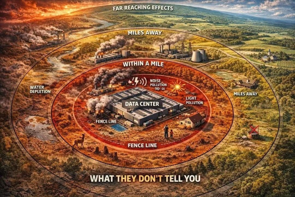 Τα datacenters «σκοτώνουν» ό,τι άφησαν ζωντανό οι ανεμογεννήτριες, καθώς με την τεράστια κατανάλωση νερού, την αδιάκοπη ενεργειακή τους δίψα, τον συνεχή θόρυβο, τη φωτορύπανση και τις εκπομπές ρύπων, «ρουφάνε» κυριολεκτικά τη ζωή γύρω τους, επιβαρύνοντας ασφυκτικά το περιβάλλον, τους φυσικούς πόρους και την ποιότητα ζωής των τοπικών κοινωνιών.
