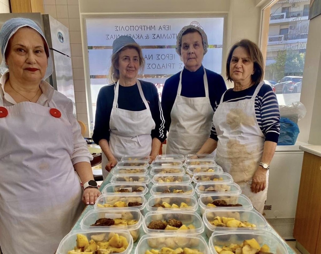 Οι εθελόντριες αναλαμβάνουν καθημερινά την προετοιμασία δεκάδων μερίδων φαγητού για όσους έχουν ανάγκη, φέρνοντας στην πράξη το πνεύμα της αλληλεγγύης και της προσφοράς.