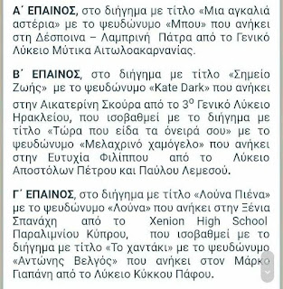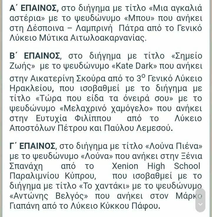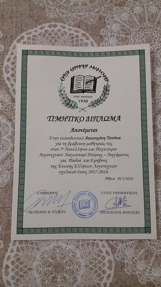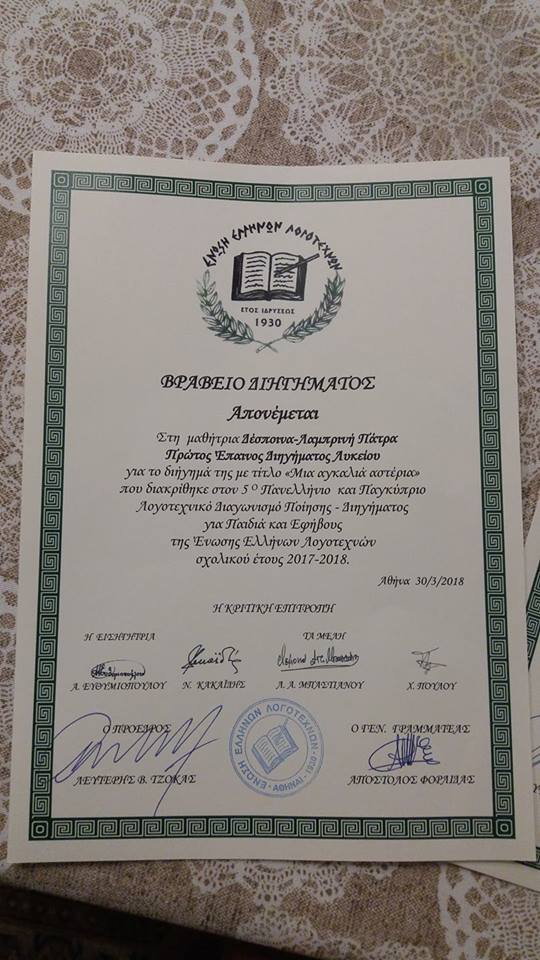 Εκ μέρους του συλλόγου Διδασκόντων του Γενικού Λυκείου Μύτικα και εκ μέρους του Διευθυντή κ. Νικόλαου Πολίτη, εκφράζω τα θερμά συγχαρητήρια στην μαθήτρια μας Δέσποινα – Λαμπρινή Πάτρα για τη συγγραφική της προσπάθεια και την τιμητική διάκριση που απέσπασε στον Πανελλήνιο Λογοτεχνικό Διαγωνισμό της Ένωσης Ελλήνων Λογοτεχνών. Καλή συνέχεια, Δέσποινα, στη λογοτεχνική σου πορεία και καλή επιτυχία στη μάχη των Πανελλαδικών εξετάσεων!