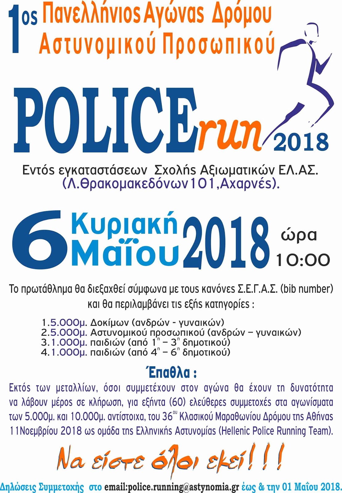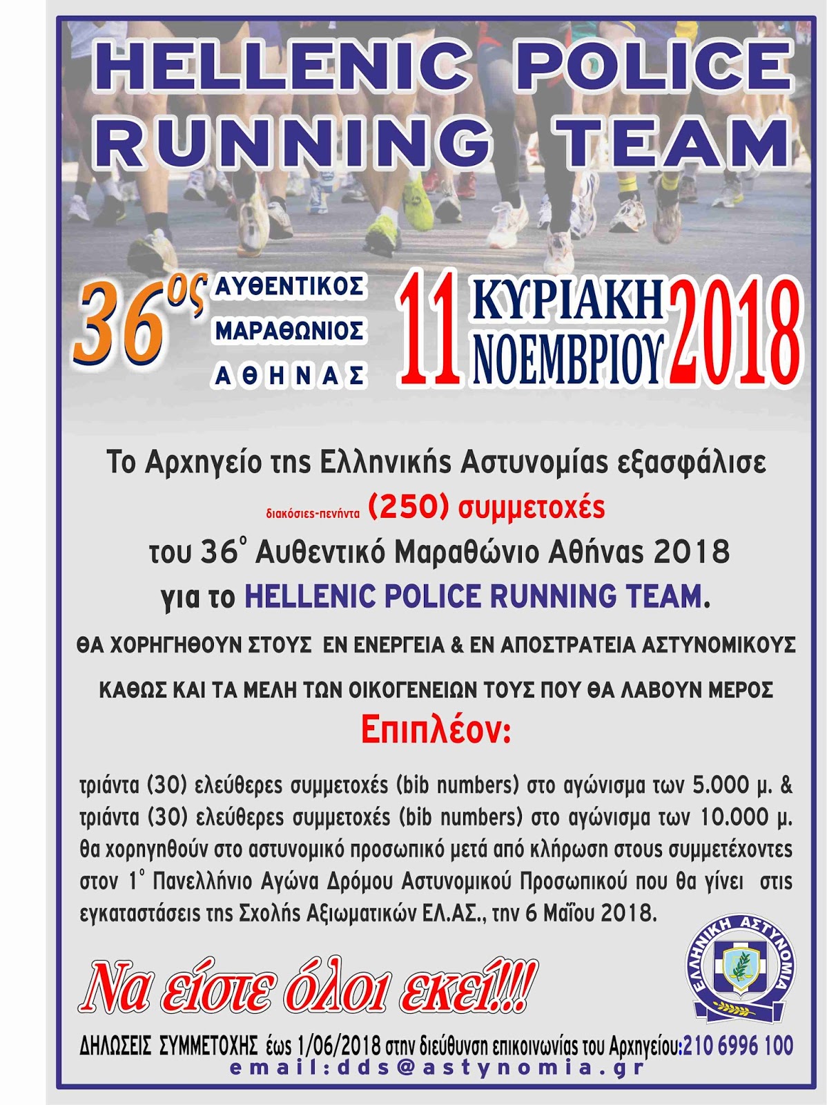 Στο πλαίσιο τής εξωστρέφειας και της προσπάθειας τής ΕΛ.ΑΣ. να αναδείξει πως το προσωπικό της είναι αναπόσπαστο κομμάτι της κοινωνίας δεν σταματά στη διοργάνωση ενός αγώνα. Στον 36ο Αυθεντικό Μαραθώνιο τής Αθήνας, στελέχη του Σώματος θα συγκροτήσουν τη Hellenic Running Team, την ομάδα της Αστυνομίας. Το Αρχηγείο, μάλιστα, έχει εξασφαλίσει 250 δωρεάν συμμετοχές για τον Νοέμβριο.