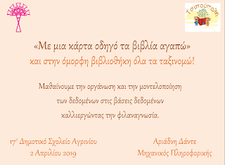 Μπορεί το νέο μου μακροπρόθεσμο πλάνο να έχει τίτλο «Με μια κάρτα οδηγό τα βιβλία αγαπώ», αλλά ο αποψινός τίτλος του άρθρου μου έχει διαφορετική ονομασία. Κι αυτό συνέβη επειδή έχει μείνει στο μυαλό μου η προχθεσινή γλυκιά ατάκα της Ελένης Μάντζιου, εκπαιδευτικού και υπεύθυνης της δανειστικής βιβλιοθήκης του 17ου Δημοτικού Σχολείου Αγρινίου, που καθώς με σύστηνε το Σάββατο 6 Απριλίου στα πρωτάκια του σχολείου στην παλιά λαχαναγορά Αγρινίου, με αποκάλεσε ως την «κυρία της οθόνης».