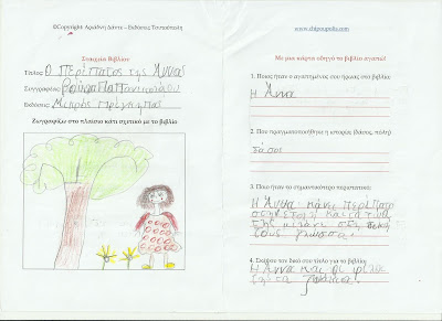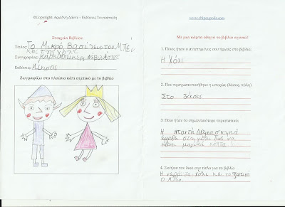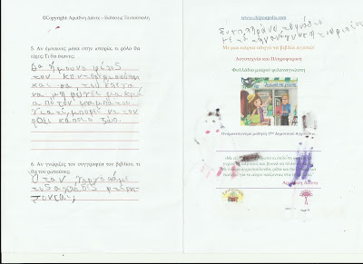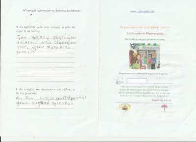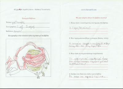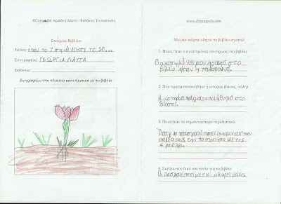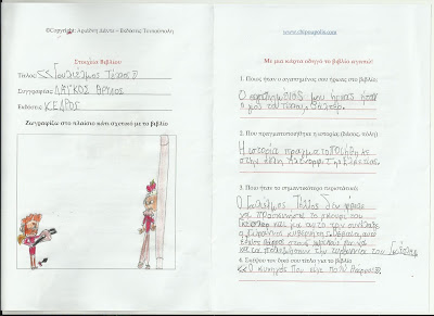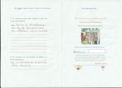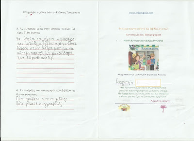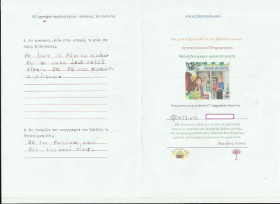 Άφησα για το τέλος το σχολιασμό του ερωτήματος προς το συγγραφέα. Αλήθεια, ποιος από τους συγγραφείς που συνομιλεί με τους μικρούς φιλαναγνώστες δε θέλει να απαντήσει στα ακόλουθα ερωτήματα: