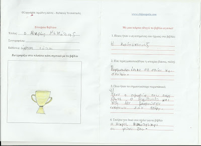 Οι ερωτήσεις που έπρεπε να απαντήσουν οι μικροί φιλαναγνώστες αφορούσαν στον αγαπημένο τους ήρωα στο βιβλίο, στον εντοπισμό του χώρου στον οποίο πραγματοποιήθηκε η ιστορία, στο σημαντικότερο κατά την κρίση τους περιστατικό και στην επιλογή διαφορετικού τίτλου για το βιβλίο. Το φυλλάδιο περιελάμβανε και ένα σημαντικό ερώτημα δημιουργικής γραφής, που ωθούσε στα παιδιά στη συγγραφή μιας διαφορετικής εξέλιξης της ιστορίας μιας και καλούνταν να συμμετέχουν και τα ίδια ως ήρωες του βιβλίου και ένα ερώτημα προς το συγγραφέα του βιβλίου.