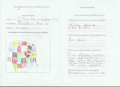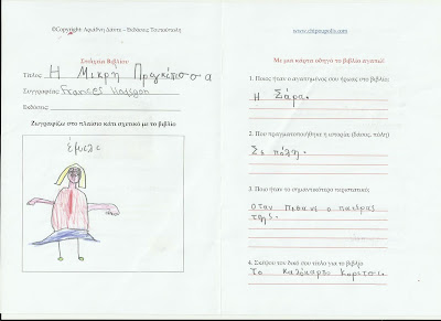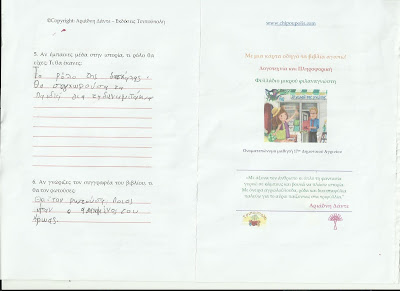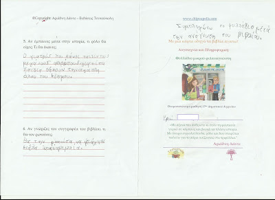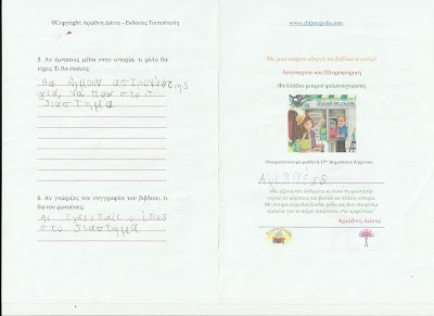Παρατηρώντας τα φυλλάδια εργασίας των εξάχρονων μαθητών πλημμύρισα από υπερηφάνεια και χαρά, γιατί μέσα από το μεράκι των εκπαιδευτικών τους και τη θέλησή τους να ακολουθήσουν την ιδέα μιας συγγραφέως έβαλαν τα πρωτάκια του 17ου Δημοτικού Σχολείου Αγρινίου στα ίχνη της Λογοτεχνίας με τον καλύτερο -κατά τη γνώμη μου- τρόπο.