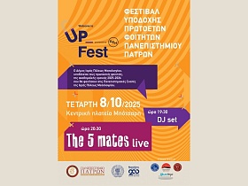 Welcome to Up Fest στην Ιερή Πόλη Μεσολογγίου Φεστιβάλ Υποδοχής Πρωτοετών Φοιτητών στις 8 Οκτωβρίου Ο Δήμος Ιερής Πόλης Μεσολογγίου, σε συνεργασία με το Πανεπιστήμιο Πατρών, υποδέχονται τους νέους φοιτητές της ακαδημαϊκής χρονιάς 2025-2026 που θα φοιτήσουν στις Πανεπιστημιακές Σχολές της πόλης, με το φεστιβάλ «Welcome to Up Fest»! ? Πλατεία Μπότσαρη, Τετάρτη 8 Οκτωβρίου 2025 ? Πρόγραμμα: 19:30 | DJ Set 20:30 | The 5 mates (live) Συμμετέχουν: Ναυτικός Όμιλος Μεσολογγίου Messolonghi by Locals…