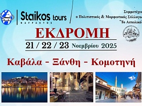 Τριήμερη εκδρομή σε Καβάλα, Ξάνθη, Κομοτηνή διοργανώνει ο Πολιτιστικός και Μορφωτικός Σύλλογος «Το Αιτωλικό». Η ανακοίνωση: Tριήμερη Εκδρομή στη Θράκη Καβάλα – Ξάνθη – Κομοτηνή 21, 22 & 23 Νοεμβρίου 2025 Τιμή κατ’ατομο σε δίκλινο/Τρίκλινο 175€ Διαφορά Μονόκλινου 50€ Δηλώσεις Θέσεων με ΠΡΟΚΑΤΑΒΟΛΗ 80 € έως 10 Οκτωβρίου 2025 Εξόφληση έως 10 Νοεμβρίου 2025 Περιλαμβάνονται: -Πούλμαν για όλες τις μεταφορές -Διαμονή (2 νύχτες) σε ξενοδοχείο 3* στο Κέντρο της Ξάνθης με πρωινό -Ασφάλεια αστικής…