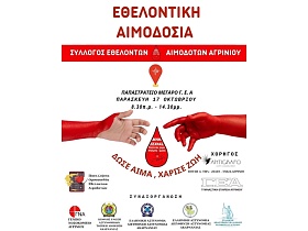Σε εθελοντική αιμοδοσία καλεί ο Σύλλογος Εθελοντών Αιμοδοτών Αγρινίου. Θα πραγματοποιηθεί την Παρασκευή 17 Οκτωβρίου στο Παπαστράτειο Μέγαρο της ΓΕΑ από ώρα 8.30 π.μ. μέχρι 2.30 μ.μ. Η ανακοίνωση του Συλλόγου Εθελοντών Αιμοδοτών Αγρινίου: ΔΩΣΕ ΑΙΜΑ – ΧΑΡΙΣΕ ΖΩΗ! Με αφορμή την εορτή του Αγίου Αρτεμίου μεγαλομάρτυρος, Προστάτη της Ελληνικής Αστυνομίας και Γερασίμου Κεφαλληνίας στις 20 Οκτώβρη, συνδιοργανώνουμε την Παρασκευή 17 Οκτωβρίου στο Παπαστράτειο Μέγαρο της Γυμναστικής Εταιρείας Αγρινίου…