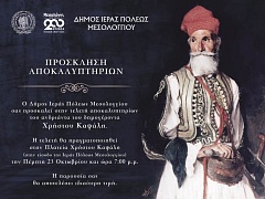 Ο Δήμος Ιεράς Πόλεως Μεσολογγίου, στο πλαίσιο των εκδηλώσεων προετοιμασίας για τη Διακοσιοστή Επέτειο της Εξόδου, διοργανώνει την τελετή αποκαλυπτηρίων του αγάλματος του Δημογέροντα Χρήστου Καψάλη, έργο του γλύπτη Ευάγγελου Τύμπα. Η εκδήλωση θα πραγματοποιηθεί στην πλατεία στην είσοδο της πόλεως, έμπροσθεν της Πύλης, την Πέμπτη 23 Οκτωβρίου 2025, στις 19:00. Τα αποκαλυπτήρια θα πραγματοποιηθούν…