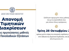 Σας προσκαλούμε να τιμήσετε με την παρουσία σας την εκδήλωση απονομής τιμητικών διακρίσεων στους πρωτεύσαντες μαθητές των Πανελλαδικών Εξετάσεων, η οποία θα πραγματοποιηθεί την Τρίτη, 28 Οκτωβρίου 2025, αμέσως μετά το πέρας της επετειακής παρέλασης (περίπου 12:00 μ.μ.). Η εκδήλωση θα λάβει χώρα στην αίθουσα του Δημοτικού Συμβουλίου, στο Δημαρχείο (οδός Σταυροπούλου 31), και θα είναι αφιερωμένη…