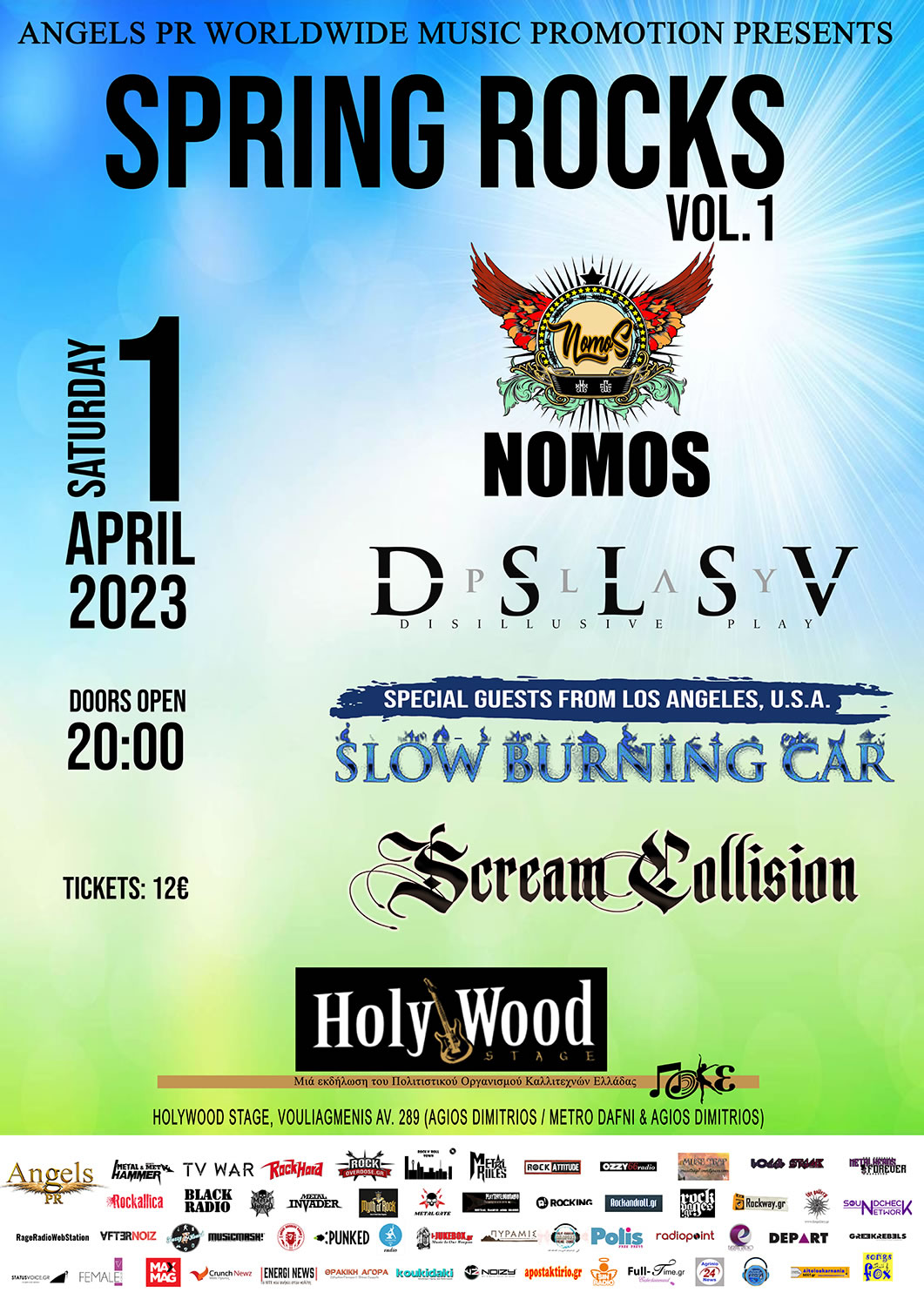Στην σκηνή του Holywood Stage θα βρεθούν οι NOMOS, DISILLUSIVE PLAY, SLOW BURNING CAR (U.S.A), και SCREAM COLLISION, τέσσερεις μπάντες με διαφορετικές μουσικές καταβολές που υπόσχονται μια απόλυτη rock βραδιά στο πιο φιλόξενο stage της πόλης.
