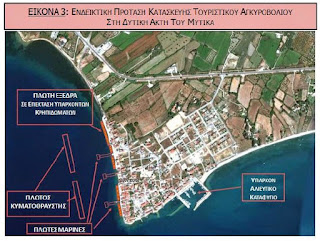 «Να κατασκευασθεί στη Δυτική παραλία του ΜΥΤΙΚΑ τουριστικό αγκυροβόλιο (μαρίνα), με πλωτές εξέδρες, με κατεύθυνση την ανάπτυξη του θαλάσσιου (ιστιοπλοϊκού) τουρισμού και την διεύρυνση της τουριστικής περιόδου.Το κόστος του έργου είναι μικρό λόγω της φύσης του (πλωτό), έχει ελάχιστη επιρροή στο περιβάλλον και με πλωτούς κυματοθραύστες που θα προστατεύεται το λιμάνι, θα προστατευθεί παράλληλα και όλο το παραλιακό Δυτικό μέτωπο του οικισμού από την καταστροφική μανία των κυματισμών του χειμώνα (ΒΛΕΠΕΤΕ ΕΝΔΕΙΚΤΙΚΗ ΕΙΚΟΝΑ 3). Κάθε επιμονή στην προσπάθεια συνέχισης κατασκευής της παράνομης επέκτασης του ΑΛΙΕΥΤΙΚΟΥ ΚΑΤΑΦΥΓΙΟΥ είναι μάταιη και δεν πρόκειται να τελεσφορήσει».
